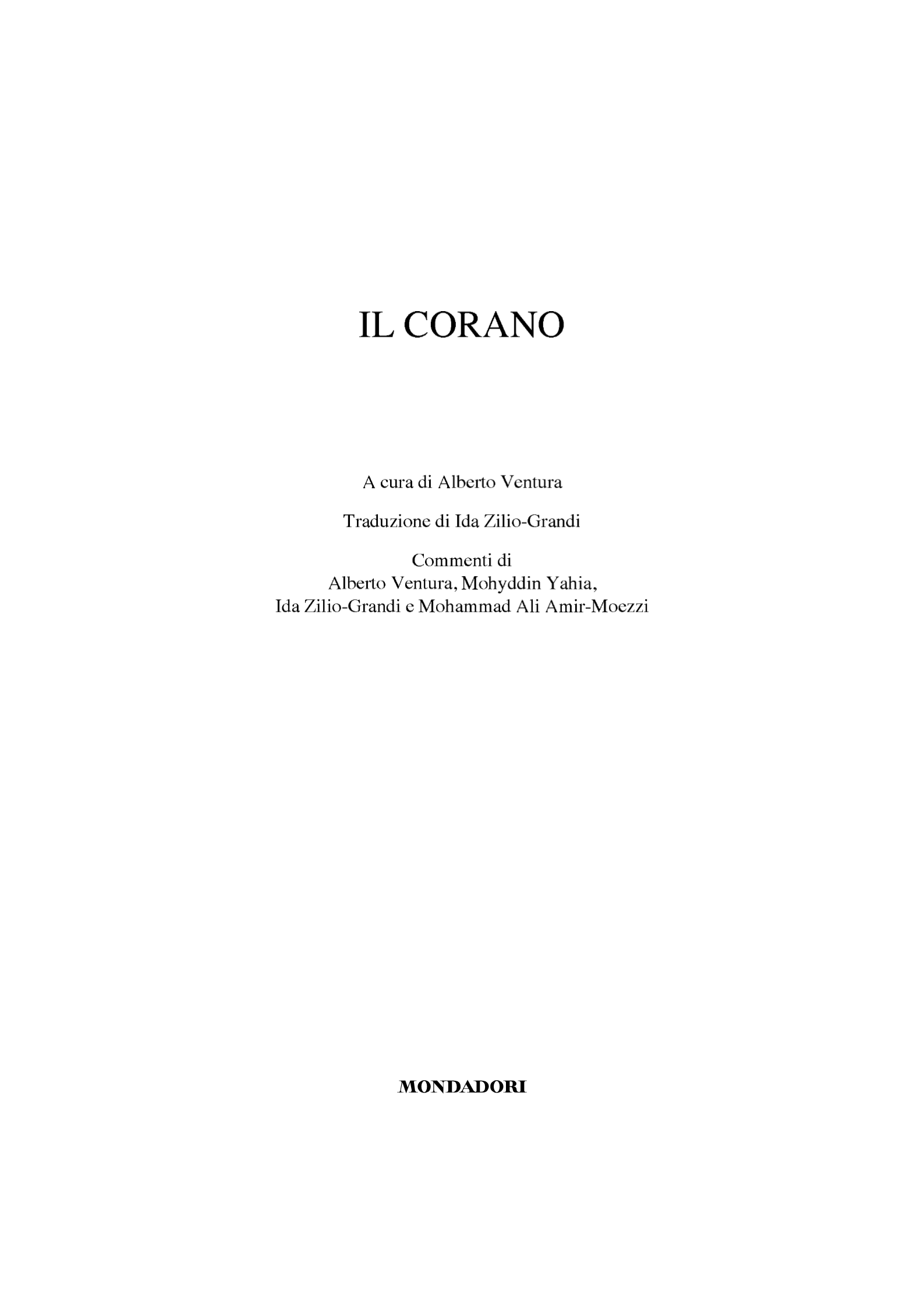 Il Corano è il Libro Sacro dell’Islam. Delle ormai numerose traduzioni italiane di questo testo, la presente, a opera di Ida Zilio-Grandi e edita da Mondadori nel 2010 (pp. 3-423), è quella corredata dal più sostanzioso e approfondito apparato di commenti, tratti dalle maggiori opere esegetiche islamiche datate dall’età formativa all’epoca contemporanea (pp. 435-887). Tali commenti sono parzialmente a cura della traduttrice (in particolare quelli alle sure 23-45, pp. 671-747); i restanti sono a cura di A. Ventura, M.A. Amir-Moezzi e M. Yahya) così come la prefazione alla traduzione (pp. LXXI-LXXII). TRADUZIONE COMPLETA, NOTA ALLA TRADUZIONE, COMMENTO ALLE SURE 23-45.