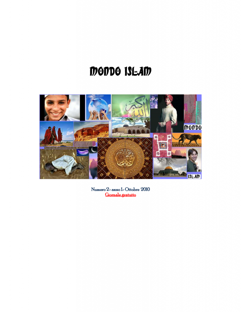 Assalamu aleikum, a distanza di un mese esce questo secondo numero. Sono davvero entusiasta, molti sono gli argomenti. Se il primo numero è stato di vostro gradimento, inshaAllah non sarà da meno il numero che state per leggere. C’è una nuova iniziativa lanciata dal fratello Ismaìl (a pag. 5) e una Grande novità! il Sito di “Mondo Islam” aperto di recente dopo il blog. Gli argomenti qui, da noi affrontati nei vari articoli sono tra i più svariati: il carattere del nostro Profeta Muhammad (saw); la morte; la medicina islamica; la preghiera; la donna e il mondo del lavoro; la finanza islamica; l’omosessualità; arti marziali ecc. E’ questo il bello del nostro giornale. Nella rubrica “Gran Bazaar”, troverete anche gli indirizzi delle moschee dove pregare, in “Cose utili per noi musulmani da sapere” c’è una lunga spiegazione su come e dove studiare la lingua araba in paesi di prevalenza musulmana: Egitto, Siria e soprattutto Medina, la città del nostro Profeta (a pag. 38 e 46). In “Animali nel mondo” vi spiegheremo cose interessanti sul cavallo arabo e il temibile coccodrillo del Nilo, e che dire delle ricette nel “Ricettario”? Vi verrà l’acquolina in bocca solo a leggerle. Mi ha assistito molto all’inizio e lo ringrazio davvero, che Allah lo ricompensi. È questa la collaborazione che vorrei fra noi inshaAllah. ono invitati tutti i musulmani a partecipare, di qualsiasi madhab (scuola), di qualsiasi corrente di pensiero, l’importante è non uscire dagli insegnamenti autentici del Profeta Muhammad (saw) e dal Sacro Corano. Qualsiasi cosa riporterete dovrà provenire da fonti sicure e non deboli o basate su interpretazioni personali.